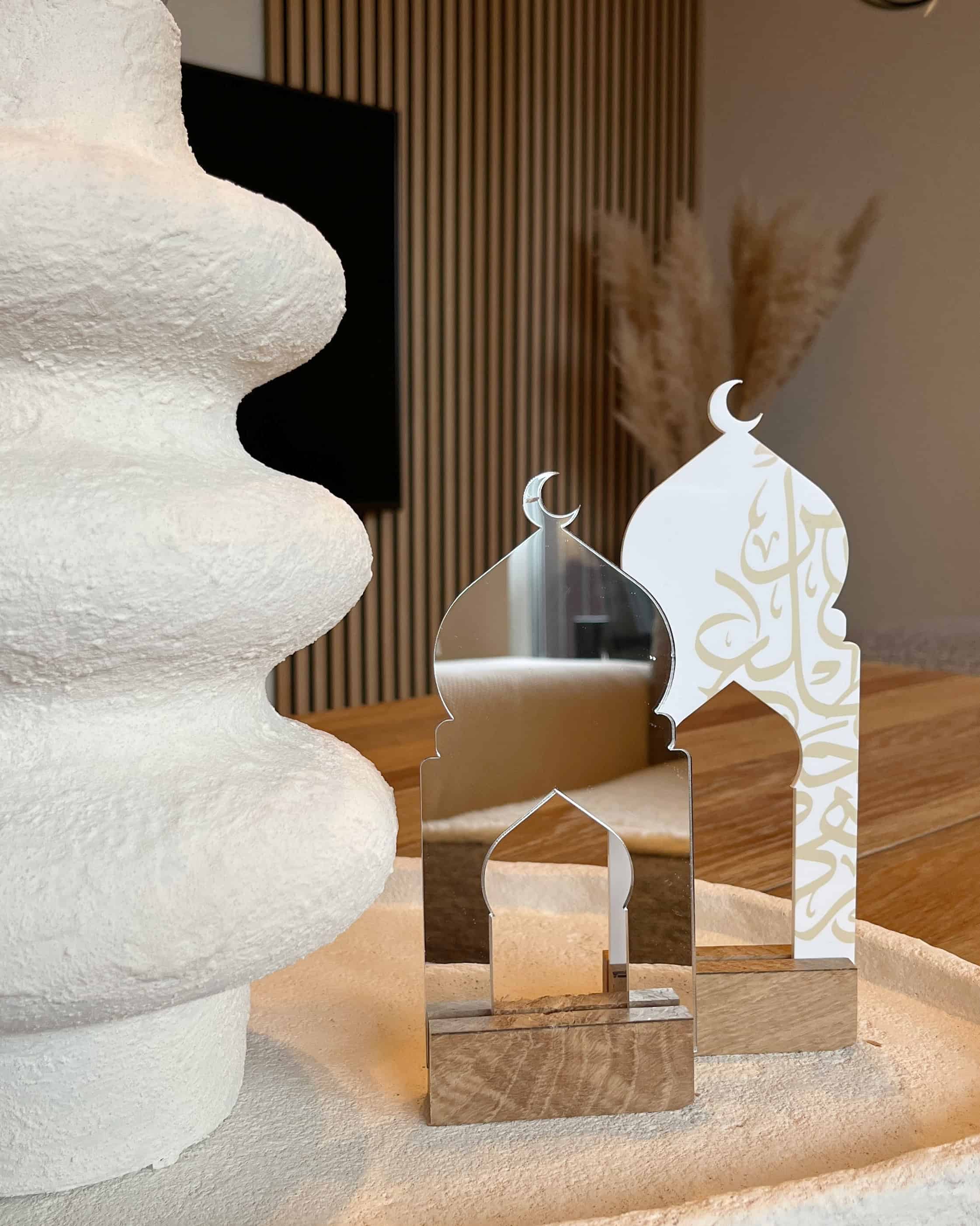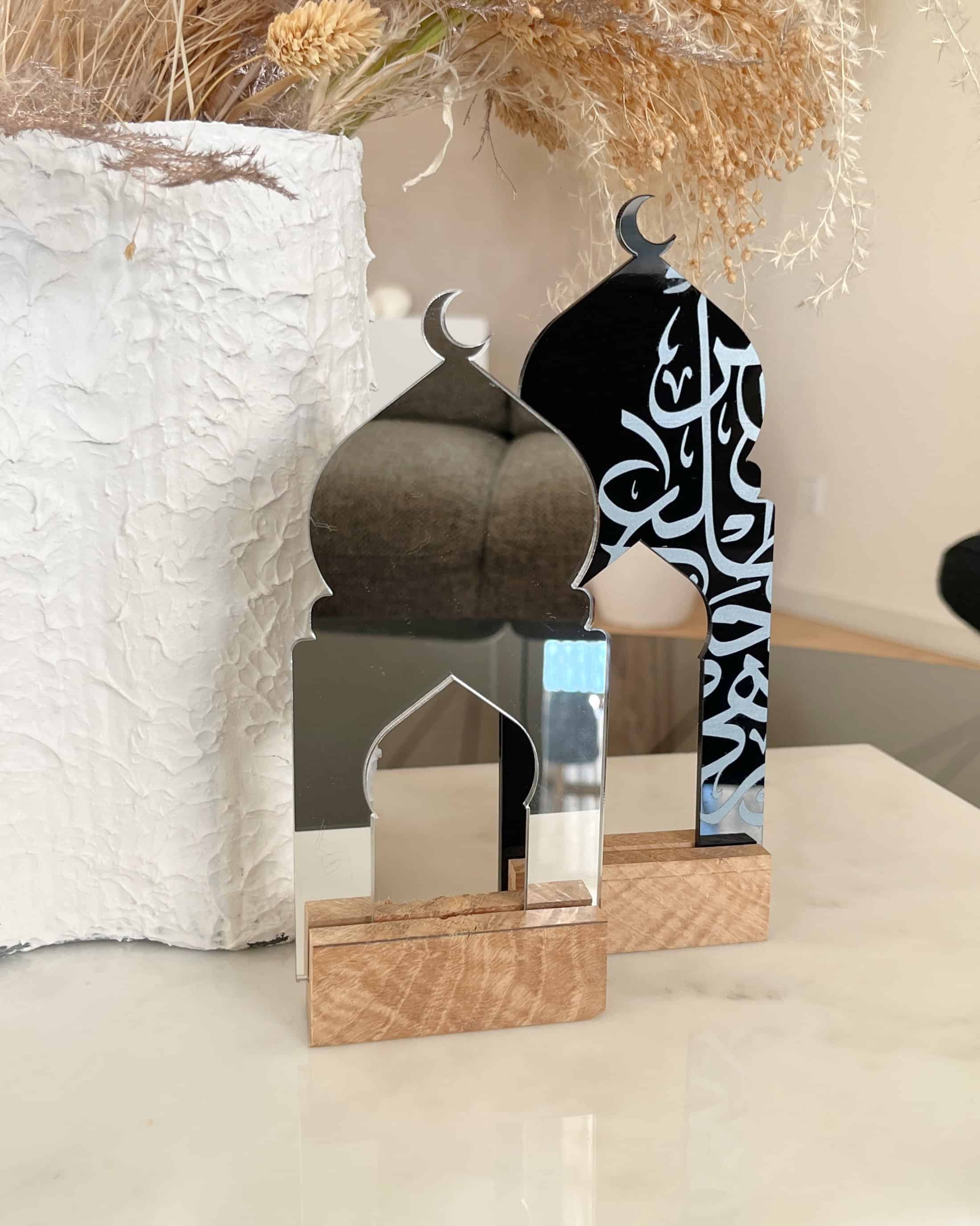 Elegante Moscheedekoration aus Acryl mit wunderschöner Kalligraphie. Besteht aus farbigem Acryl mit Aufdruck und Spiegelacryl auf einem Sockel aus massivem Eichenholz. Verleihen Sie Ihrem Zuhause eine stilvolle Note mit dieser einzigartigen und bedeutungsvollen Dekoration