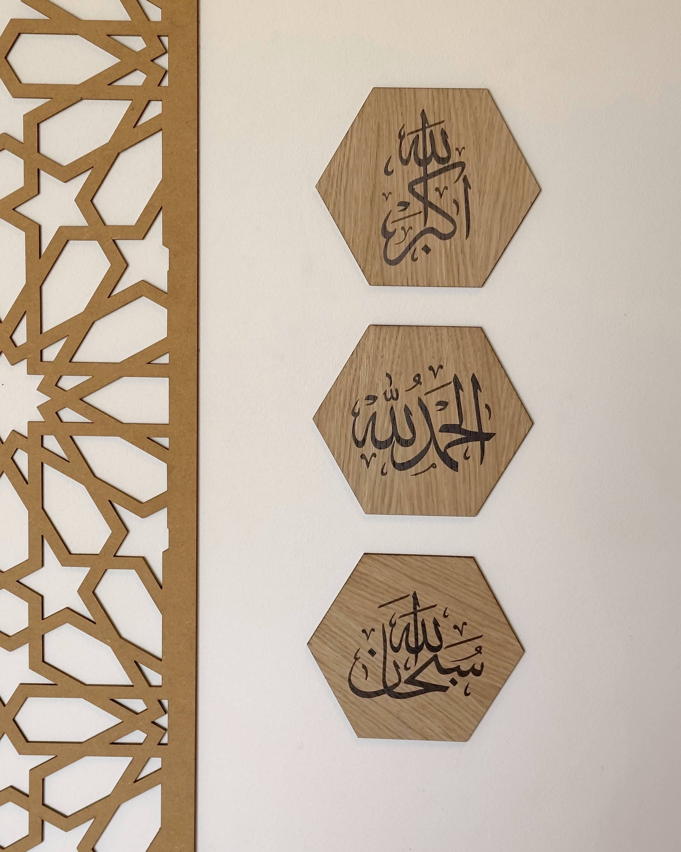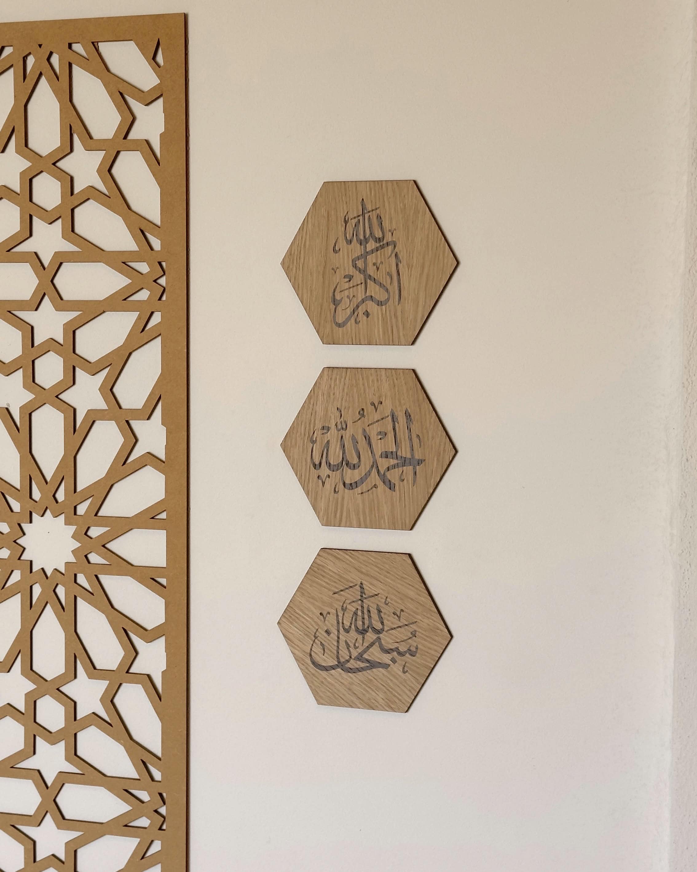 Cadres uniques à suspendre qui rappellent le souvenir d'Allah, composés de SoubhanAllah, Alhamdoulillah et Allahu Akbar. Un produit pratique, élégant et raffiné, orné de calligraphie arabe, pour décorer votre intérieur.