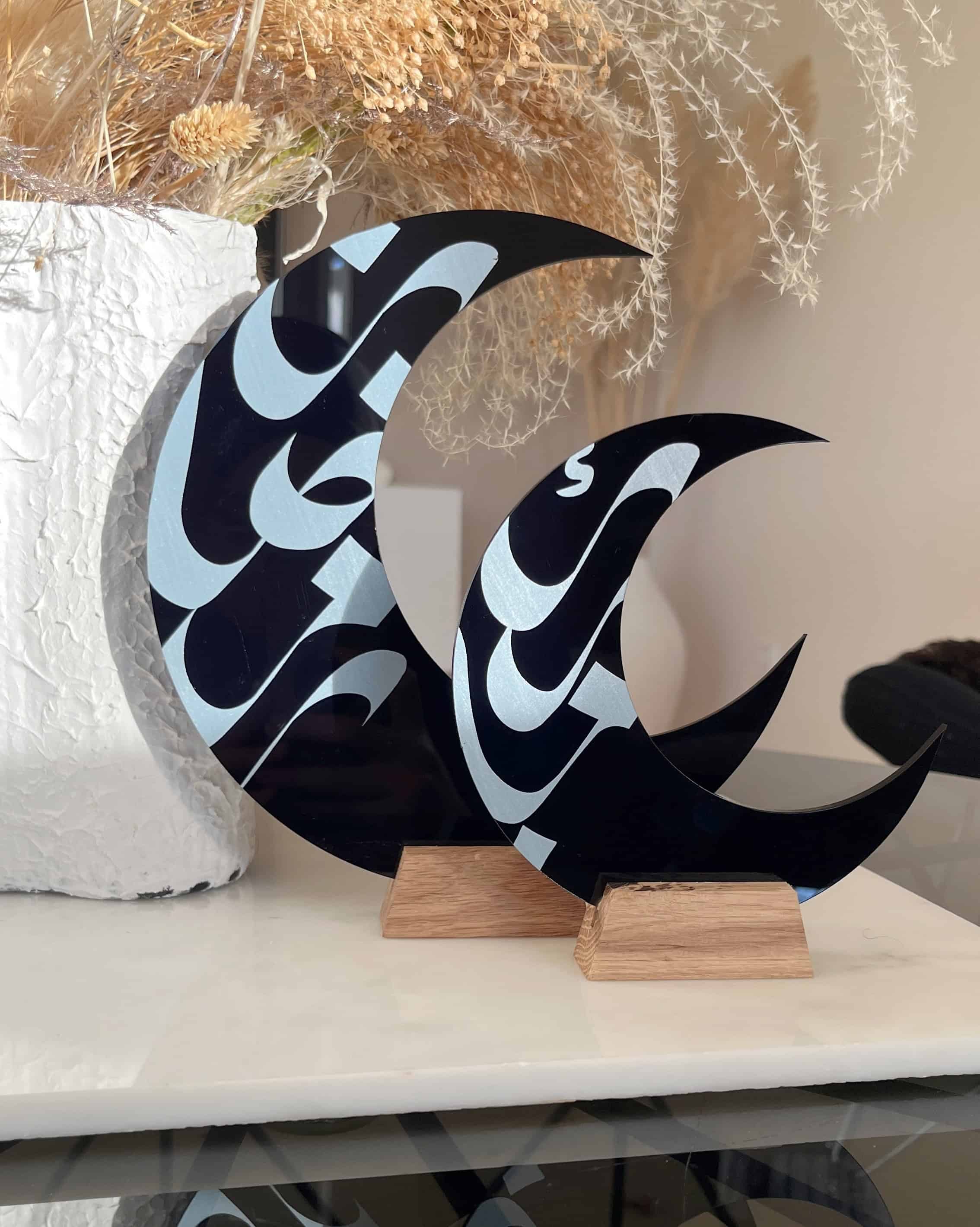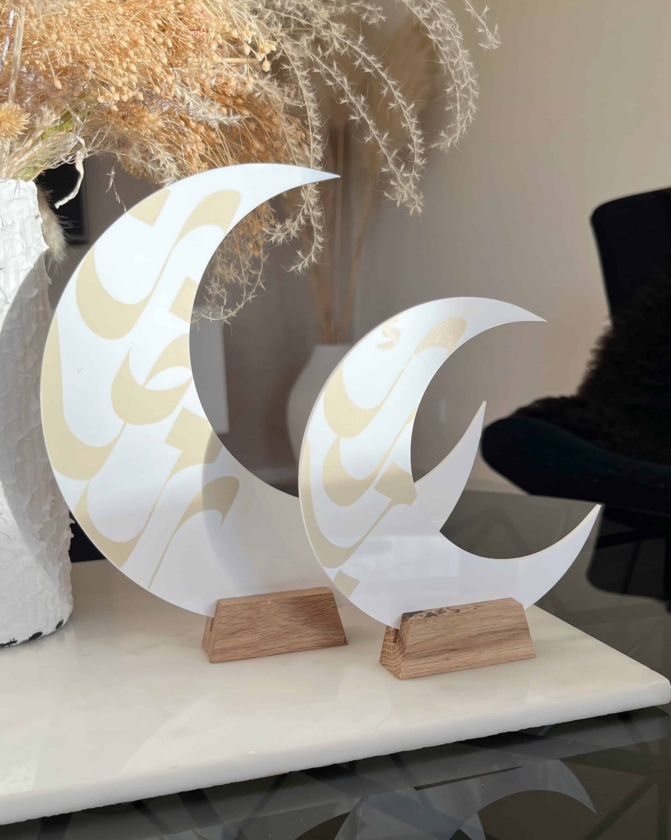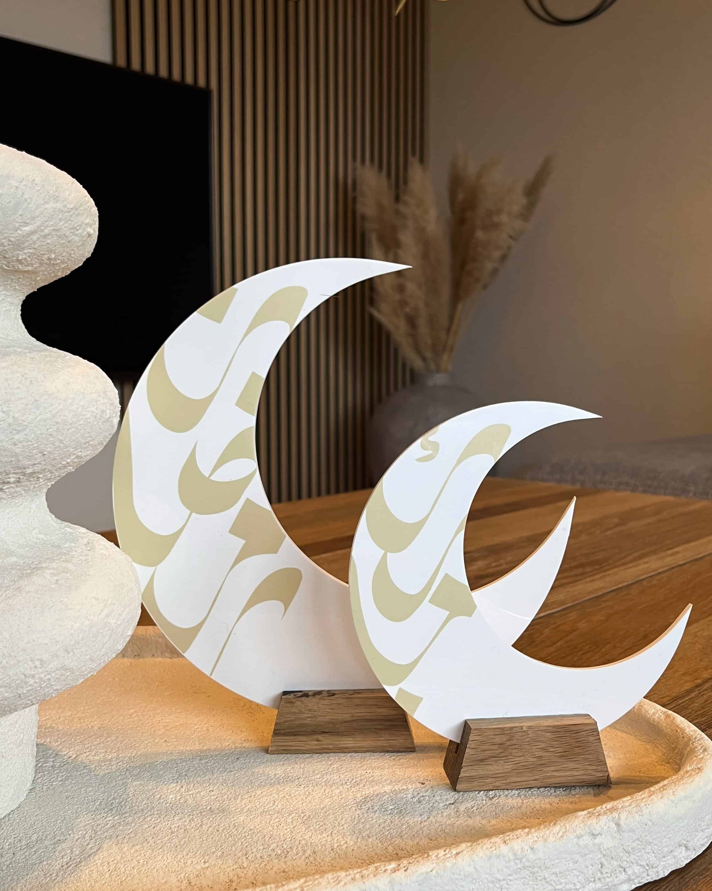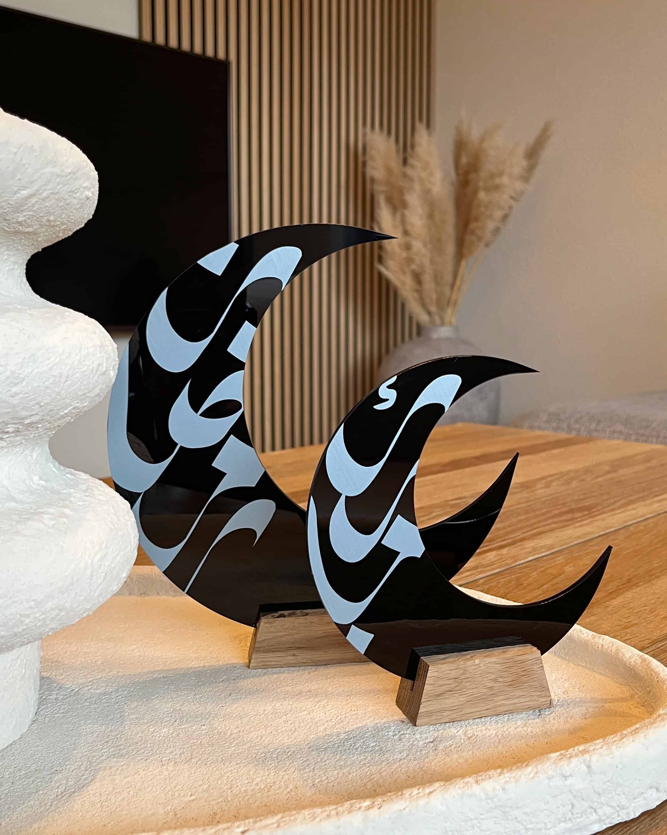 Ein einzigartiges Mond-Set mit detaillierter Kalligrafie und massivem Eichenfuß, das Eleganz und Tradition vereint. Perfekt als Wohnaccessoire oder als bedeutungsvolles Geschenk. Bringen Sie einen Hauch islamischer Kunst und Wärme in Ihr Zuhause.