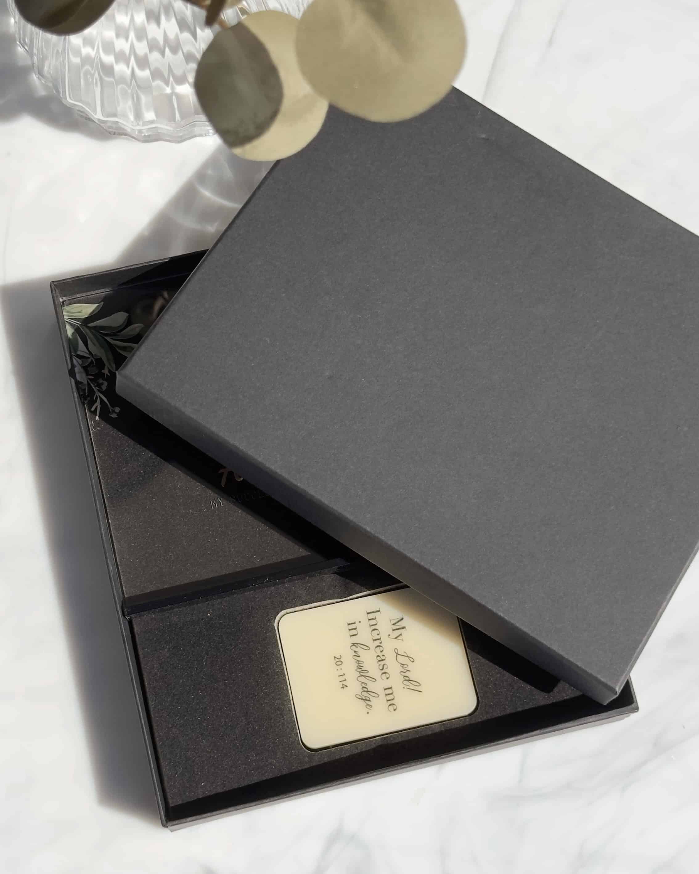 Le coffret cadeau est une solution prête à l'emploi qui s'adapte parfaitement aux fleurs ou à tout ce avec quoi vous souhaitez le combiner. Le panneau est disponible dans différentes formes et matériaux, que vous pouvez choisir selon vos souhaits. Le coffret cadeau est noir et est livré avec un élégant remplissage de boîte et du papier de soie en plus du contenu nommé.