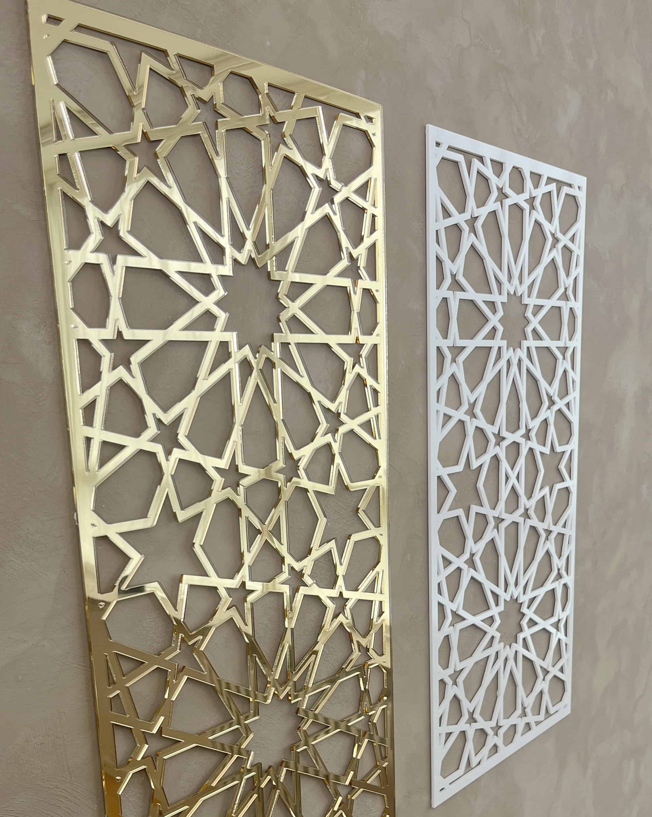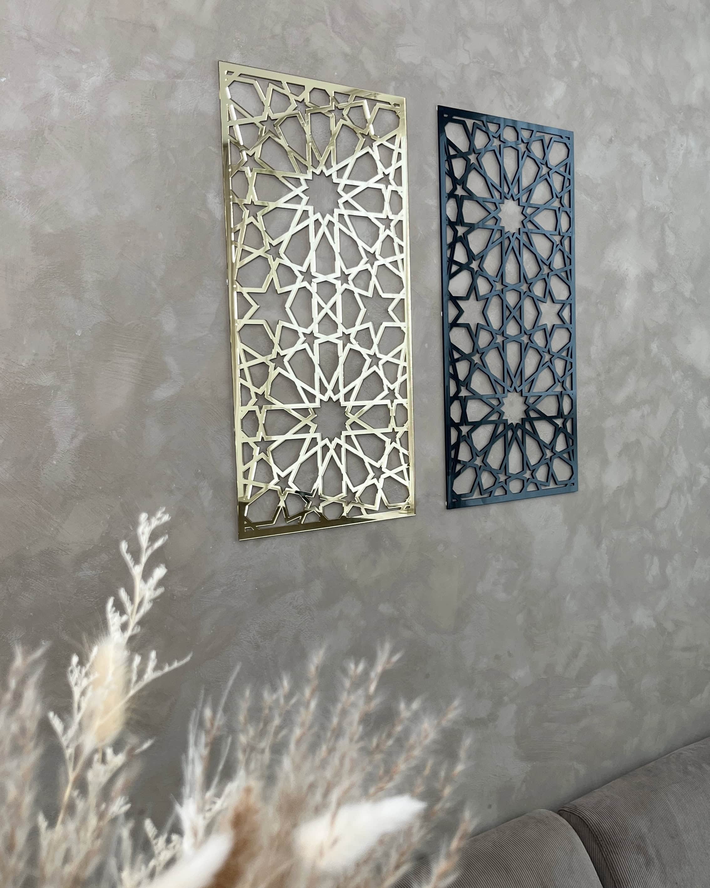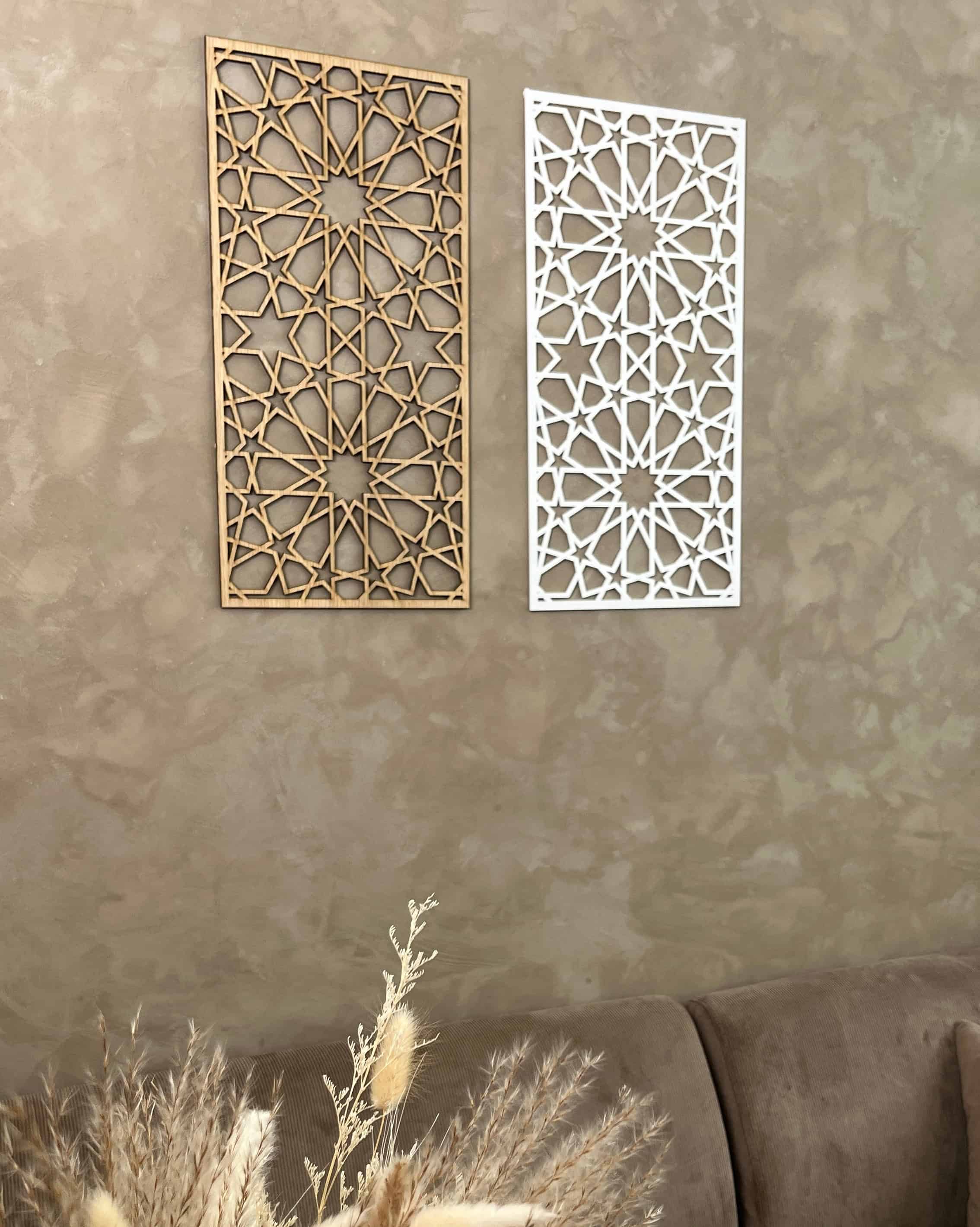 Unsere Paneele eignen sich perfekt für die Schaffung einer islamischen Identität im Zuhause. Machen Sie Ihr Zuhause mit unseren dekorativen Paneelen zu einem Ort, an dem Tradition auf modernen Stil trifft. Diese Tafeln sind von islamischer Kunst und Architektur inspiriert, in der geometrische Muster eine zentrale Rolle spielen. Sie verleihen jedem Raum in Ihrem Zuhause eine schöne und anspruchsvolle Ästhetik und spiegeln gleichzeitig das reiche kulturelle Erbe des Islam wider.