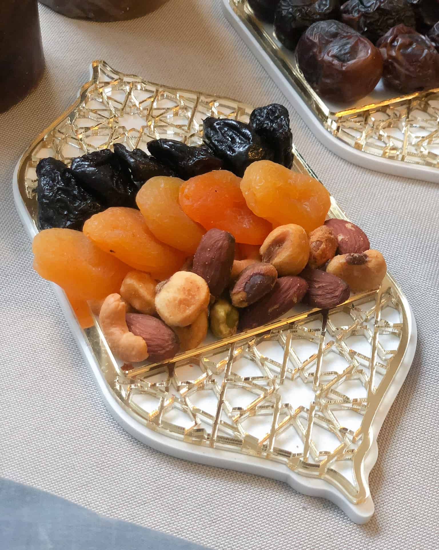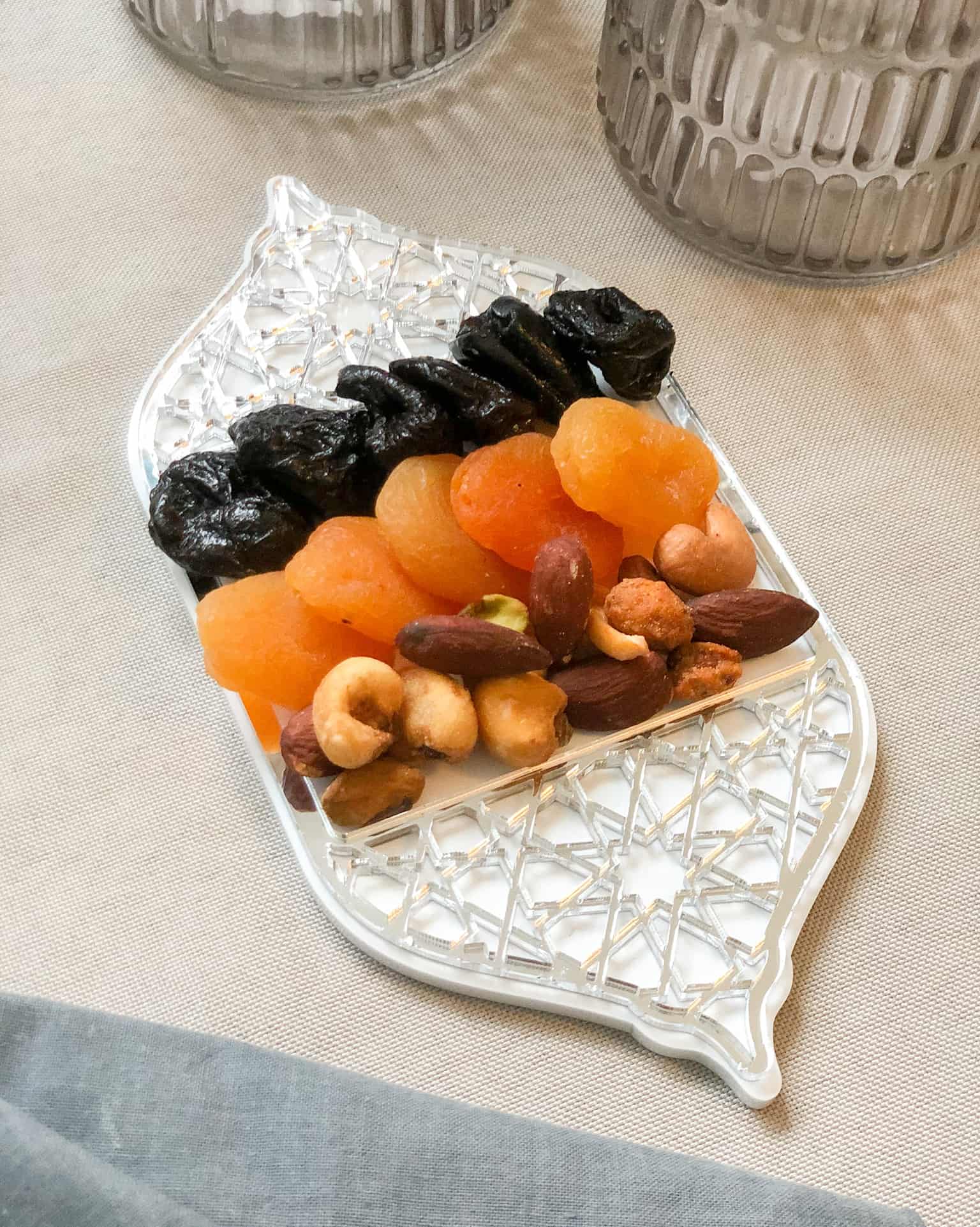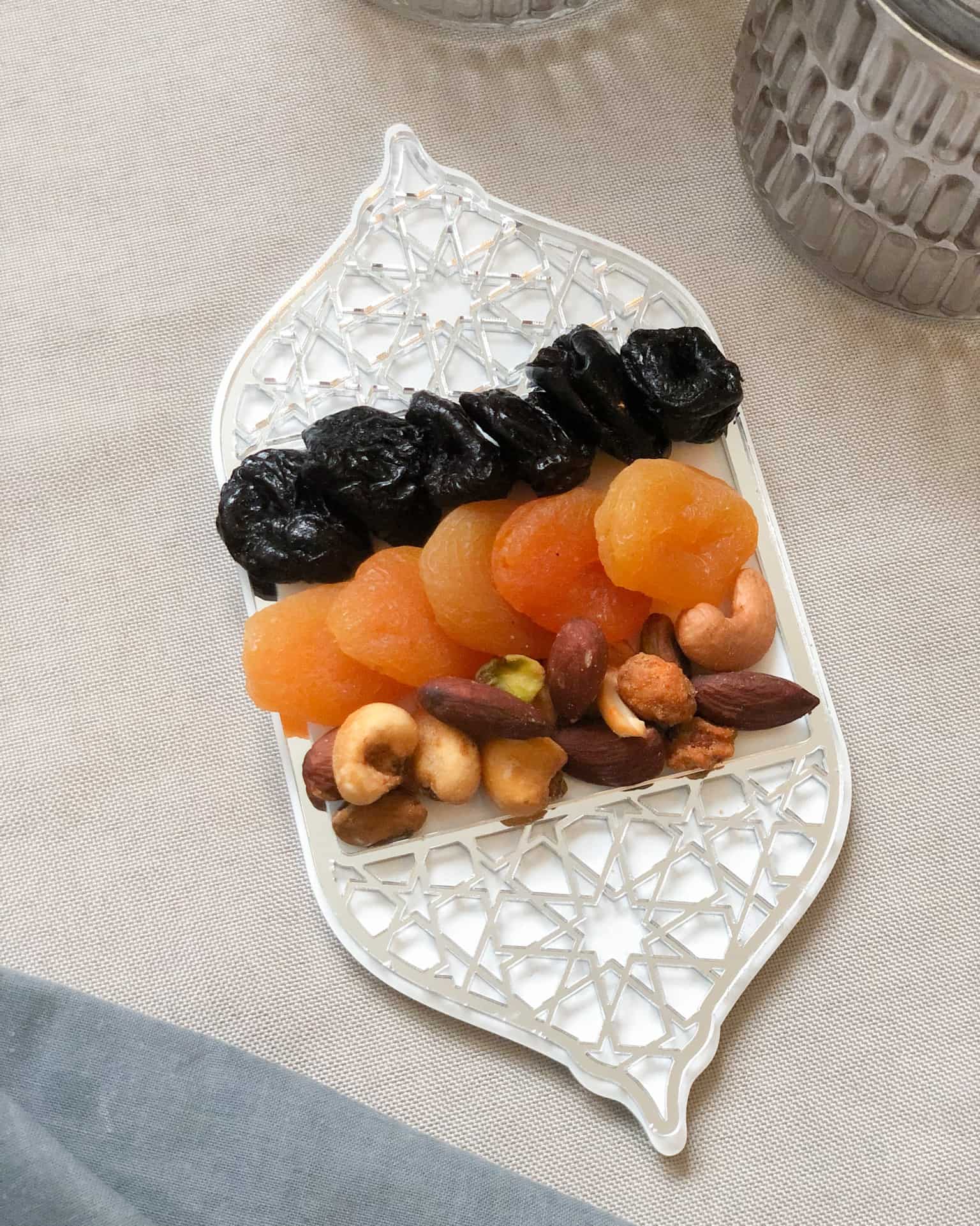 Un mini plat blanc avec un motif unique en acrylique miroir en or ou en argent, qui peut décorer n'importe quelle table basse ou table à manger lorsque vous avez des proches en visite ou réunis pour le dîner ! Le produit est de qualité alimentaire et est principalement destiné à être utilisé comme décoration et à être utilisé de manière créative pour de petites portions telles que des collations ou des dattes. Le produit ne peut pas être mis au lave-vaisselle et doit être essuyé après utilisation avec un chiffon humide.