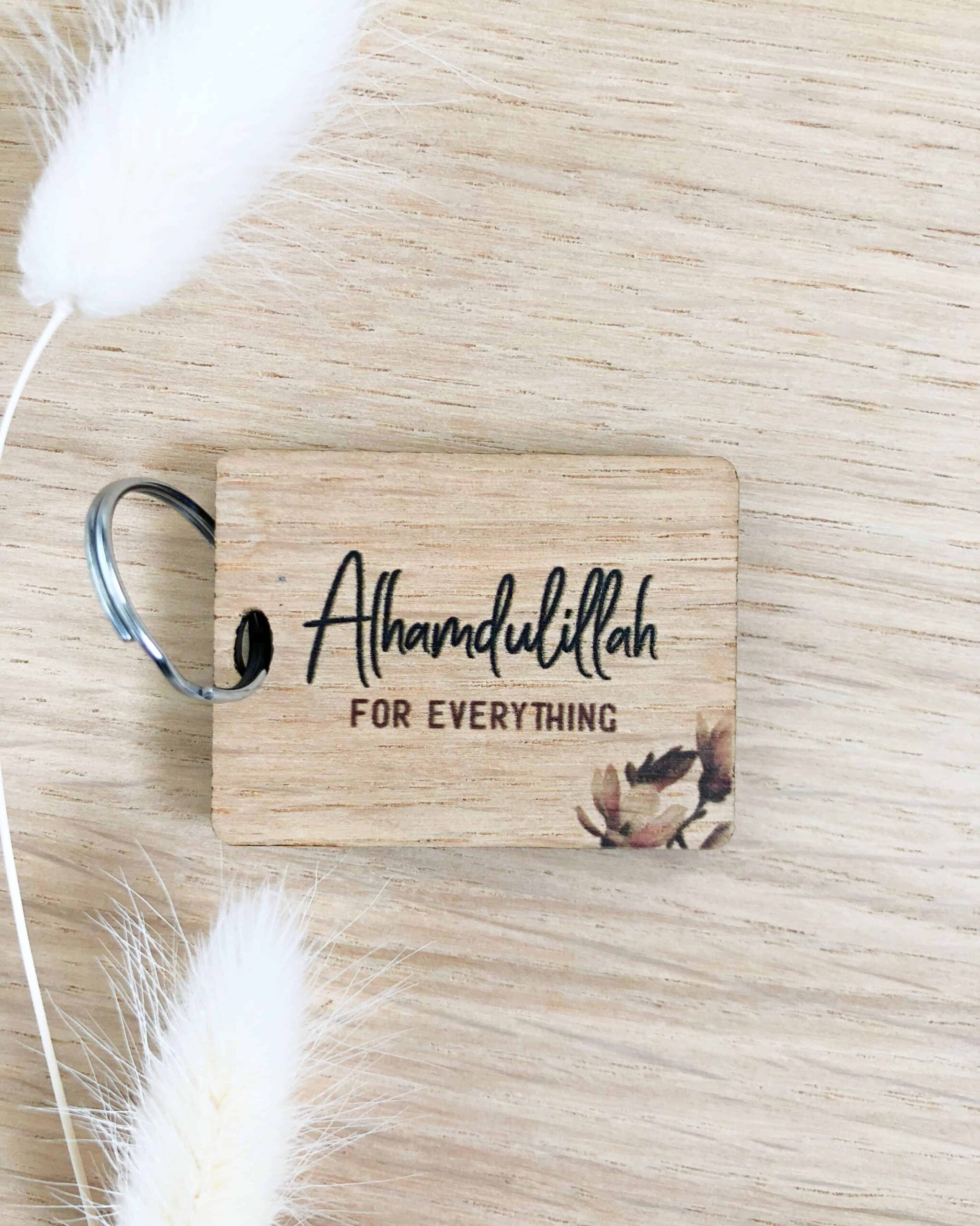 Porte-clés en placage de chêne avec le texte "Alhamdulillah pour tout" - avec une fleur et une feuille.