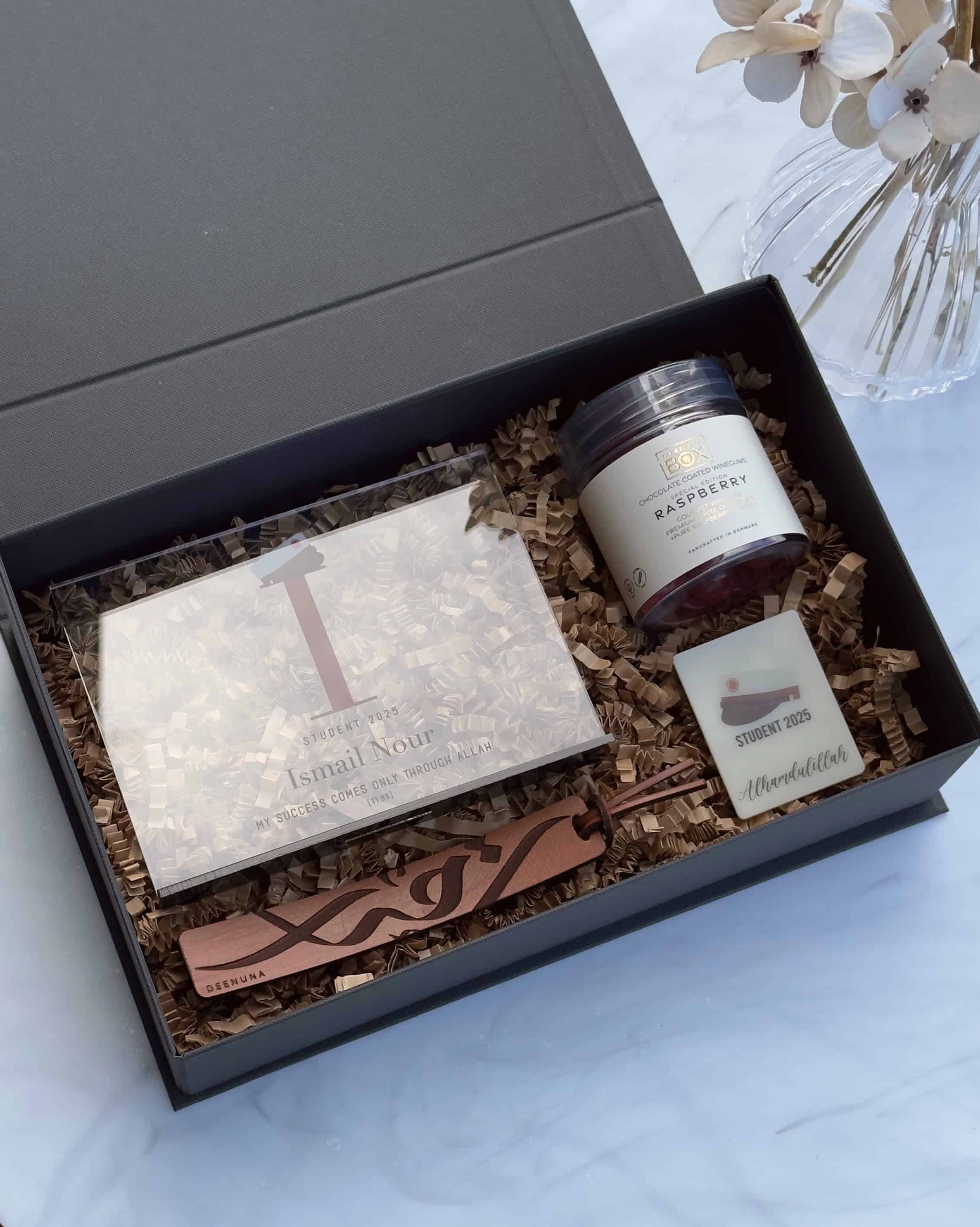 Le coffret cadeau contient un panneau personnalisé, un aimant, un marque-page en cuir et des gommes au vin enrobées de chocolat de The Original Box. Le coffret cadeau est une solution prête à l'emploi qui s'adapte parfaitement aux fleurs ou à tout ce avec quoi vous souhaitez le combiner. Le panneau est disponible dans différentes formes et matériaux, que vous pouvez choisir selon vos souhaits. Le coffret cadeau est noir et est livré avec un élégant remplissage de boîte et du papier de soie en plus du contenu nommé.