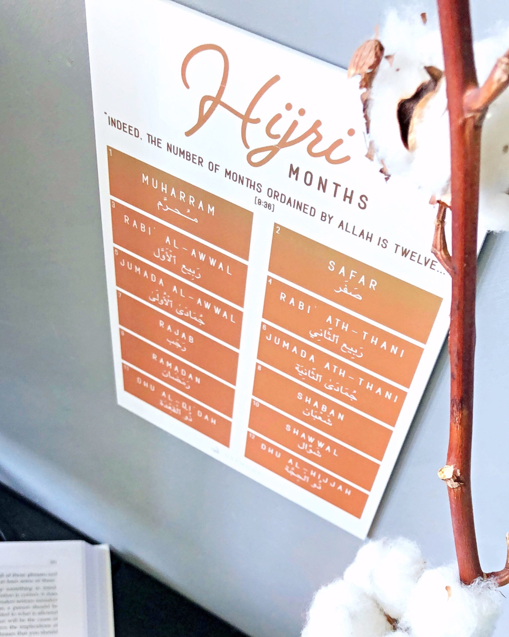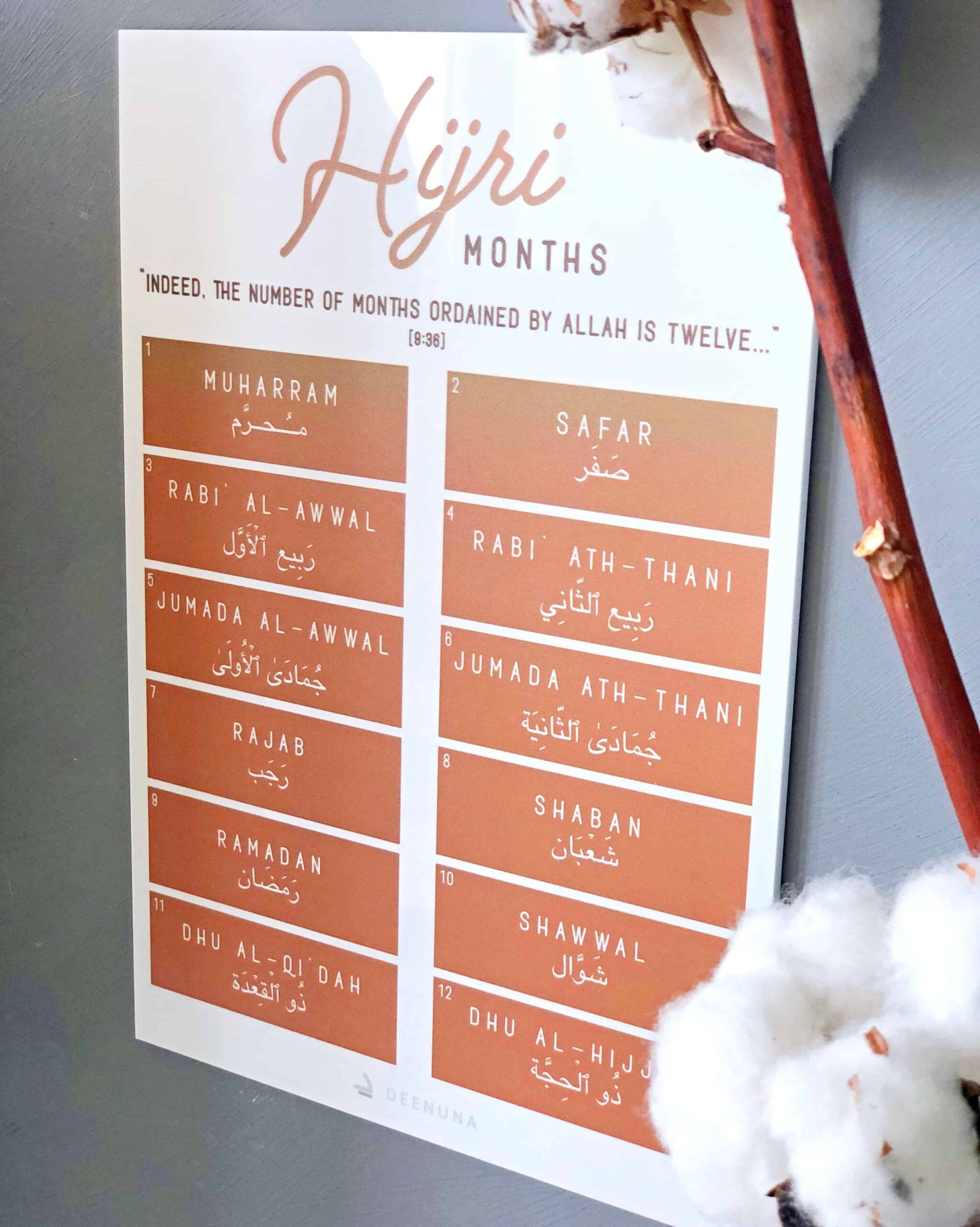 Den største begivenhed efter profetskabet af Muhammad, Allahs fred og velsignelser over ham, var indførslen af den islamiske hijri-datering. Dette er noget, som vi ønsker at mægtiggøre og give os selv og andre muslimer mere viden omkring – derfor har vi lavet dette unikke skilt, som indeholder de islamiske måneder. Det er måneder vi bør kende til og noget vi bør implementere i vores hverdag og videregive til vores børn og familier – det er en mægtig del af vores islamiske identitet.