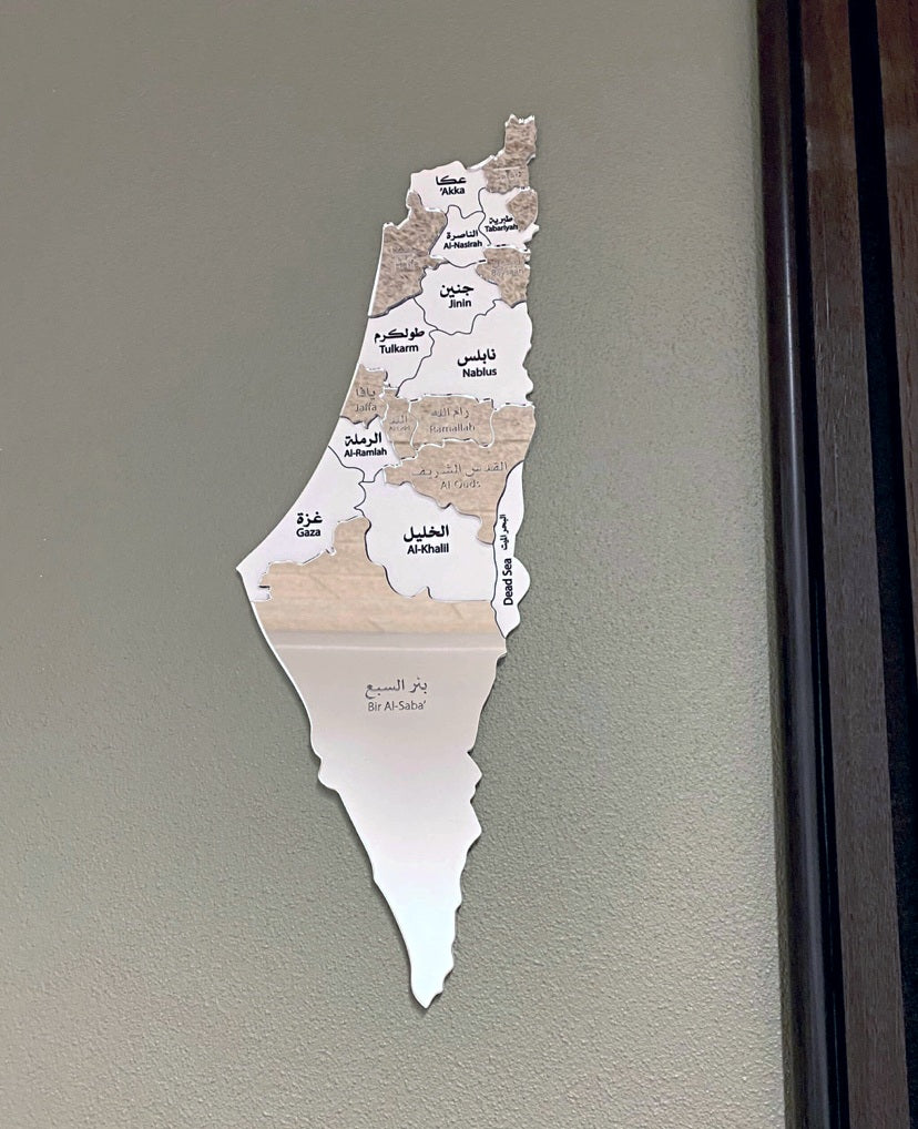 La Palestine est la terre des musulmans et joue un rôle essentiel dans la foi des musulmans. Le Prophète a effectué son voyage nocturne miraculeux à al-Quds (Jérusalem) et la mosquée al-Aqsa est la troisième mosquée la plus sainte de l'Islam. Avec cette carte, nous voulons laisser une marque importante en matière de design d'intérieur et de design : il faut se souvenir des bonnes villes. Notre foyer doit se souvenir de la Palestine.
