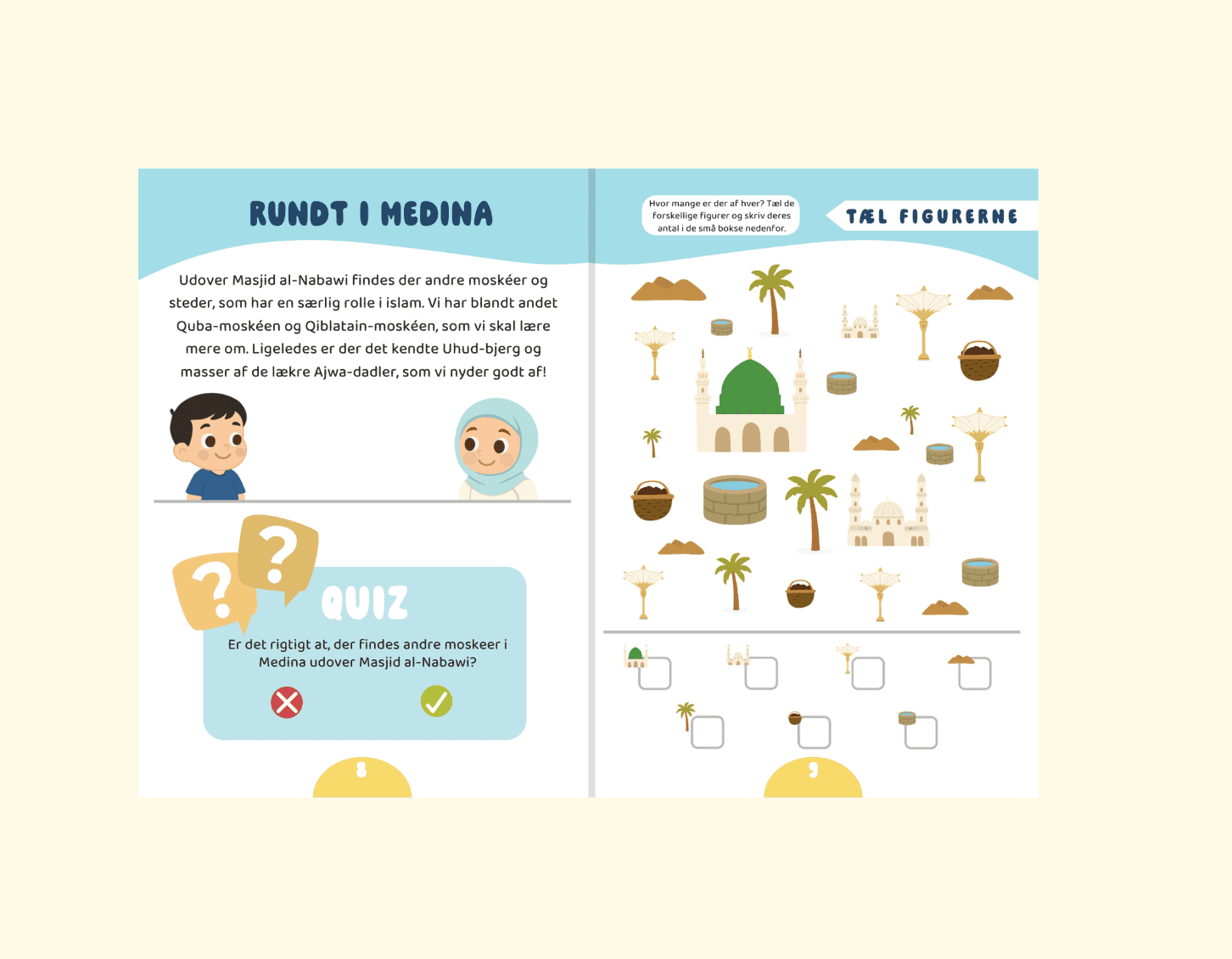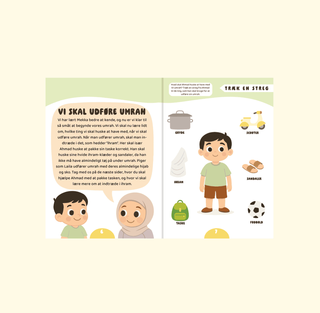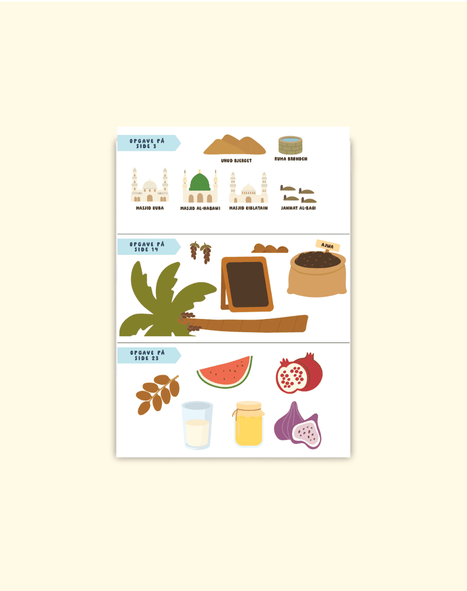 Skal dine børn til Mekka, Medina og Aqsa med Ahmad & Laila? Vores aktivitetshæfte-sæt tager børn med på tre spændende rejser til de helligste steder i Islam! Sættet består af tre hæfter. Hvert hæfte er på 24 sider, hvor der er en blanding af aktiviteter, små quiz-spørgsmål og andet gavnlig læring. Hvert hæfte indeholder et unikt A4-klistermærkeark, som er forbundet til nogle af aktiviteterne. Børnene kan farvelægge, løse labyrinter, bruge klistermærker og læse gode, børnevenlige historier, der lærer dem om islams hellige steder. Hæfterne kombinerer leg og læring på en engagerende måde og er perfekte til at styrke børns nysgerrighed, kreativitet og forståelse af islamisk historie.