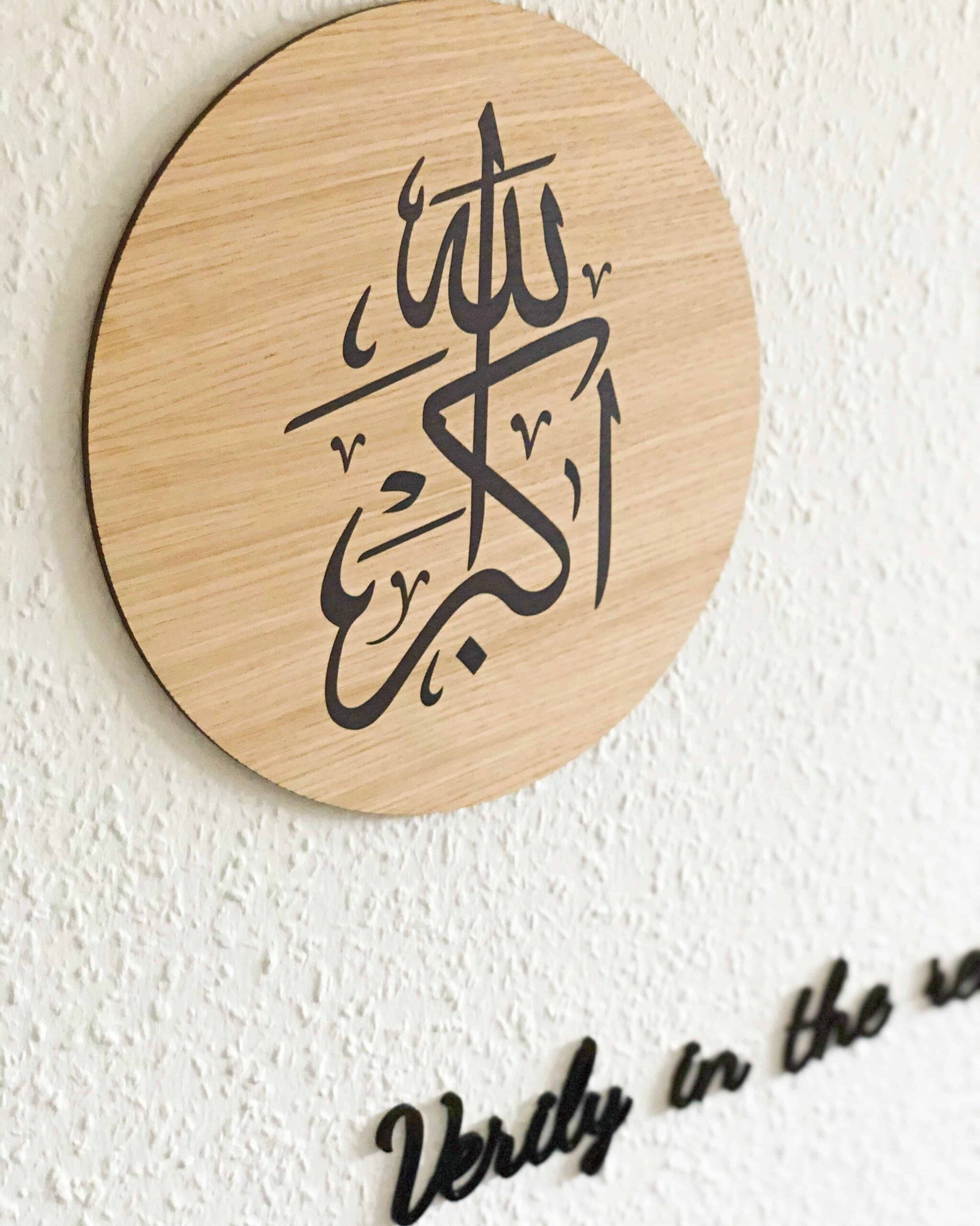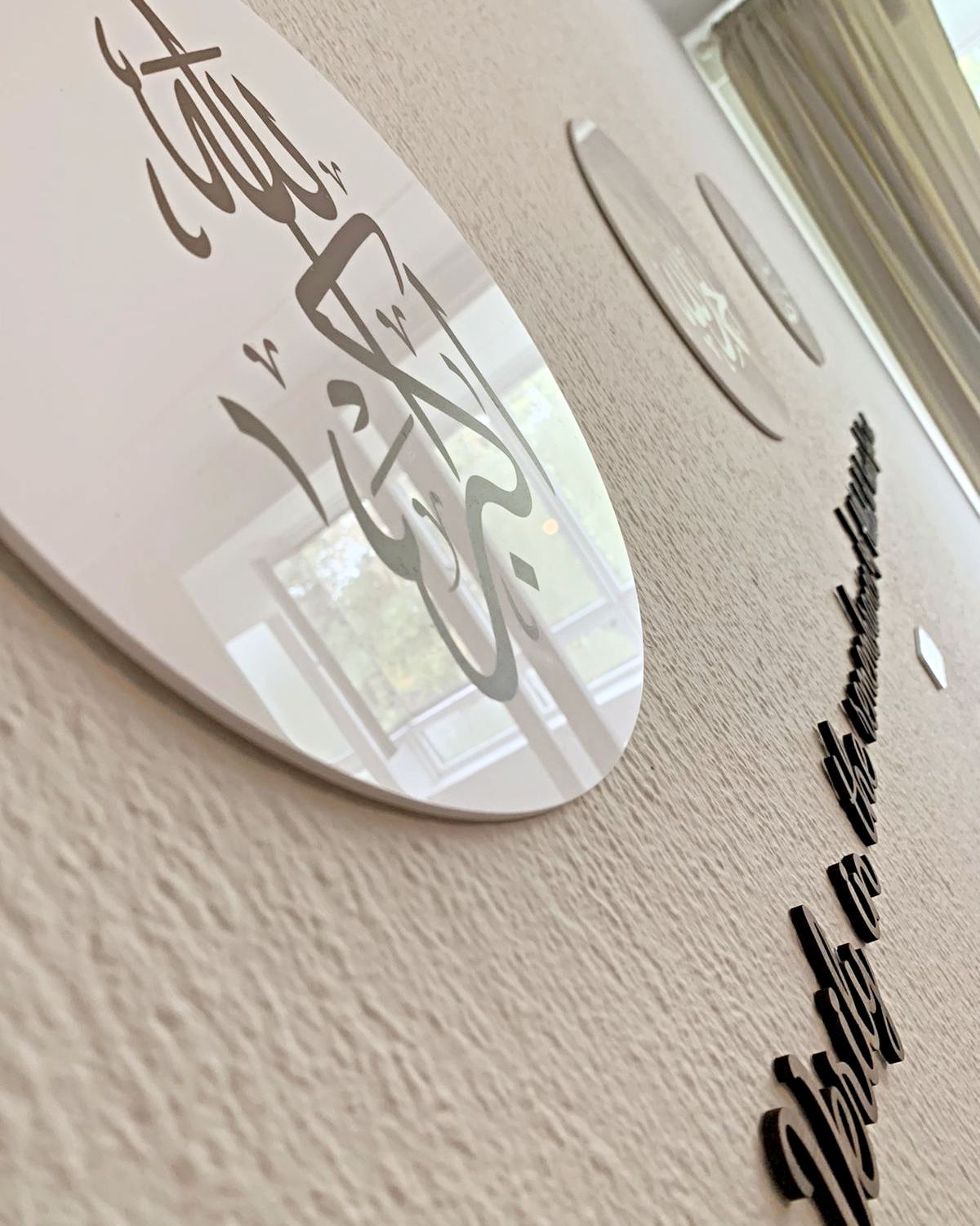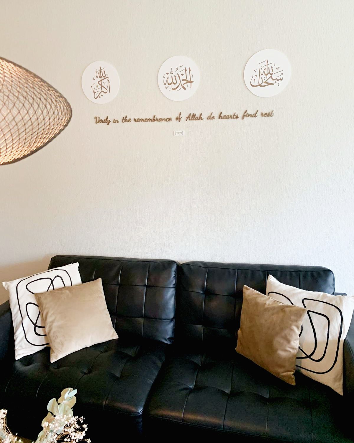 Unikke rammer til ophæng som påminder en om ihukommelsen af Allah, bestående af SubhanAllah, Alhamdulillah og Allahu Akbar. Rammerne er kombineret med verset ”Sandelig i ihukommelsen af Allah, finder hjerterne ro”. Et gavnligt produkt, men også elegant og stilrent med arabisk kalligrafi til at præge hjemmet med. Fås i hvid akryl og egefinér.