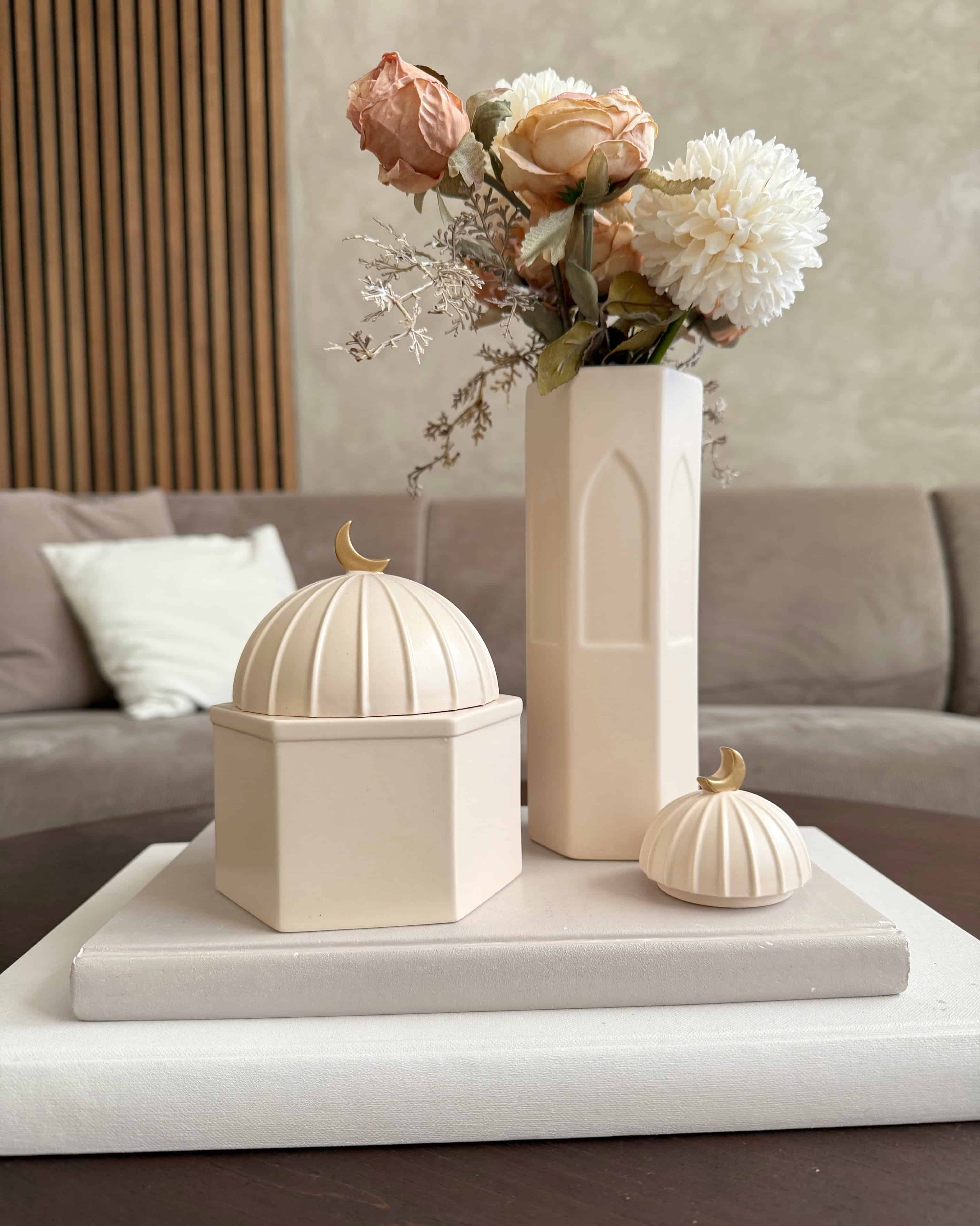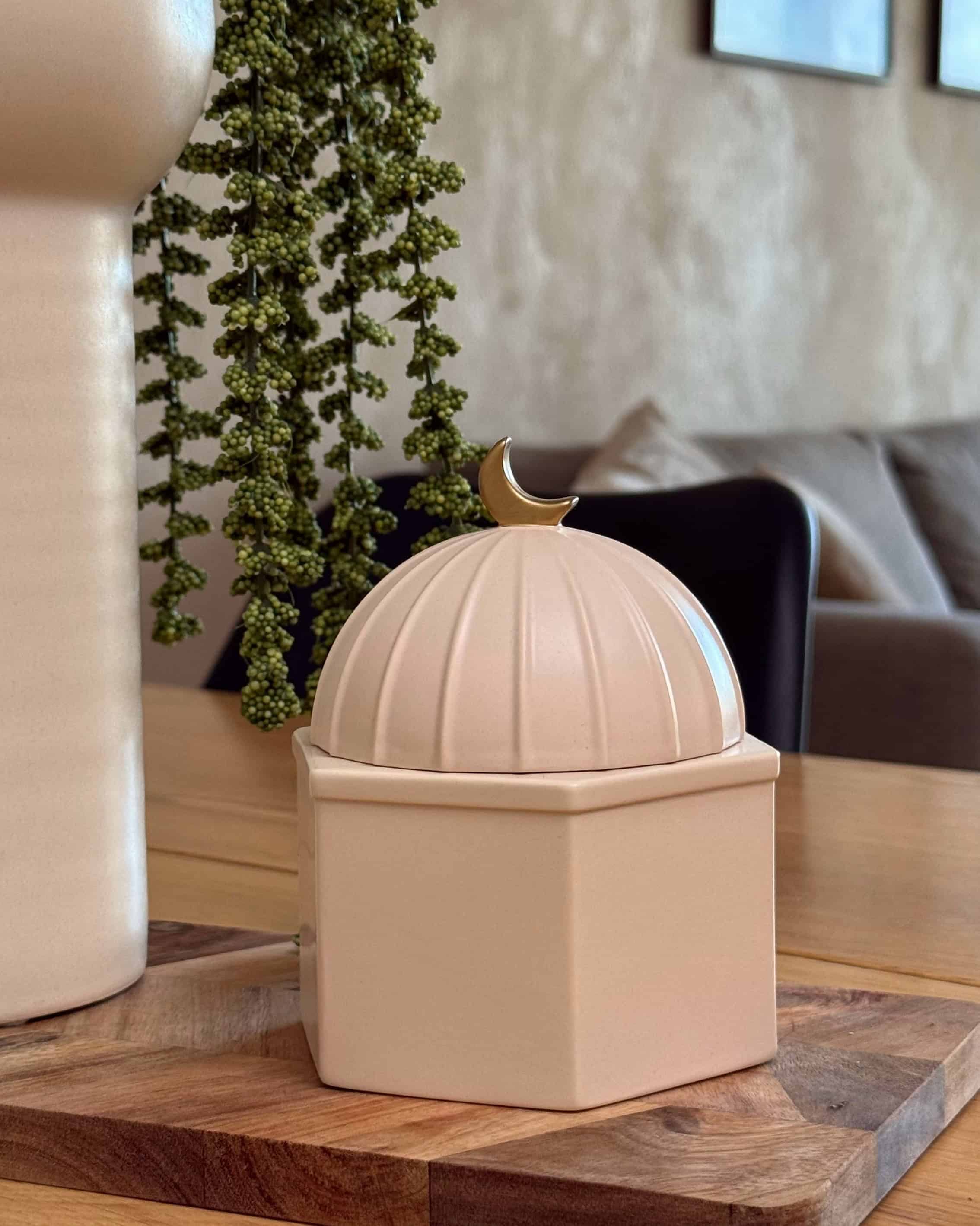 Et vaskeægte statement piece i keramik! Dome of the Rock er inspireret af Klippemoskéen i Masjid al-Aqsa – et ikonisk symbol på islamisk historie, tro og identitet. Gennem generationer har denne bygning stået som et stærkt vidnesbyrd om vores arv, og netop denne fortælling bringes ind i hjemmet gennem designet. Intet hjem må glemme al-Aqsa - dette produkt er vores ydmyge bidrag dertil. Som en del af Aqsa Collection forener produktet nutidig elegance med islamisk arv. Skålen kan anvendes til servering af dadler, snacks eller stå alene som et æstetisk statement. Et stemningsfuldt helårsprodukt – særligt smukt til gæsterne under Ramadan og Eid.