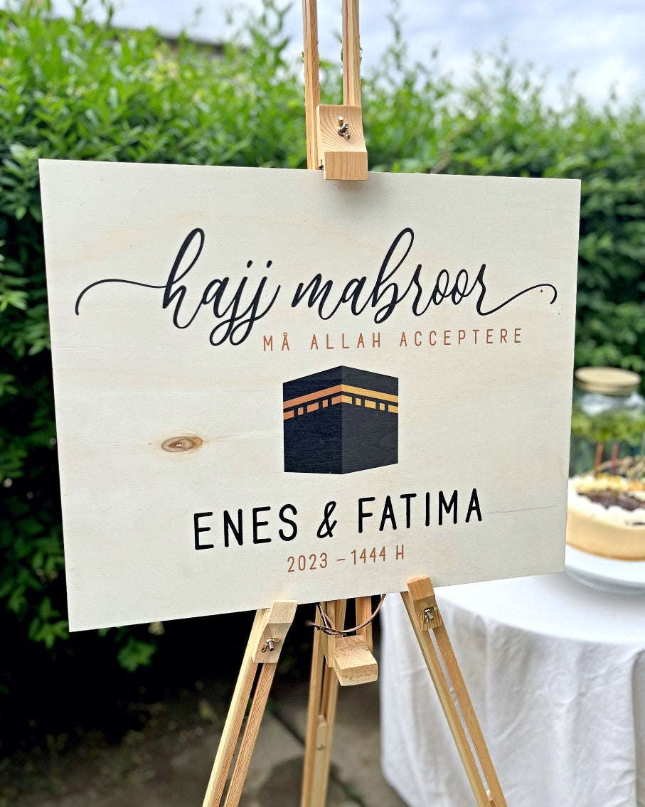 Byd de nye Hujjaj velkommen hjem på en unik måde! Et af deres største øjeblikke i livet er netop opnået og man har besøgt Mekka for at udføre den obligatoriske Hajj. Følelserne er store og som familie glæder man sig til at tage imod dem – og de glæder sig til at blive taget imod. Et øjeblik af stor glæde. Sæt skiltet på et staffeli som unik velkomst ved indgangen, dekoration ved spisebordet eller andet relevant. Et unikt skilt til et unikt øjeblik.