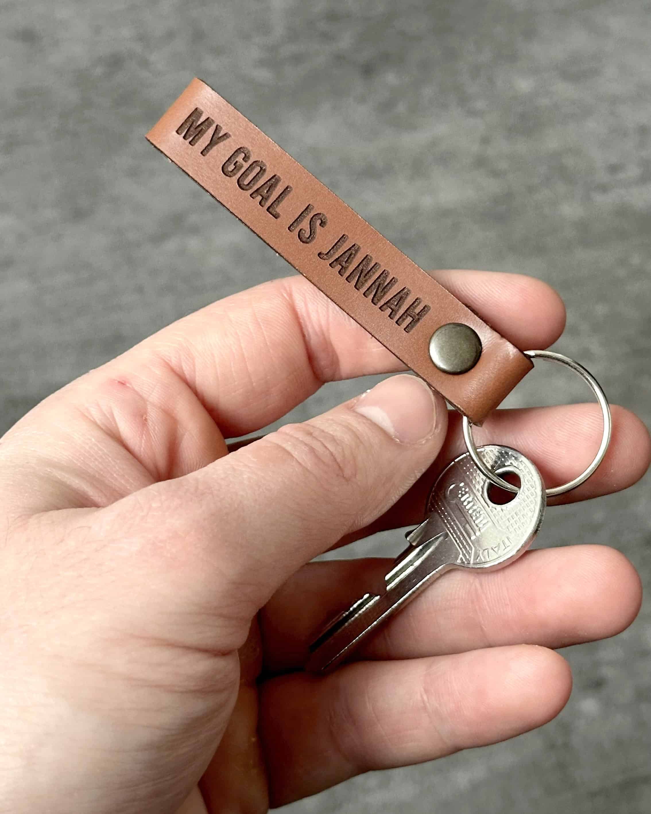 Stilfuld lædernøglering med 'My Goal is Jannah' indgraveret – en smuk påmindelse om at huske livets formål, nemlig at opnå Jannah. Perfekt som en gave eller til at tilføje en personlig og meningsfuld detalje til din dagligdag.