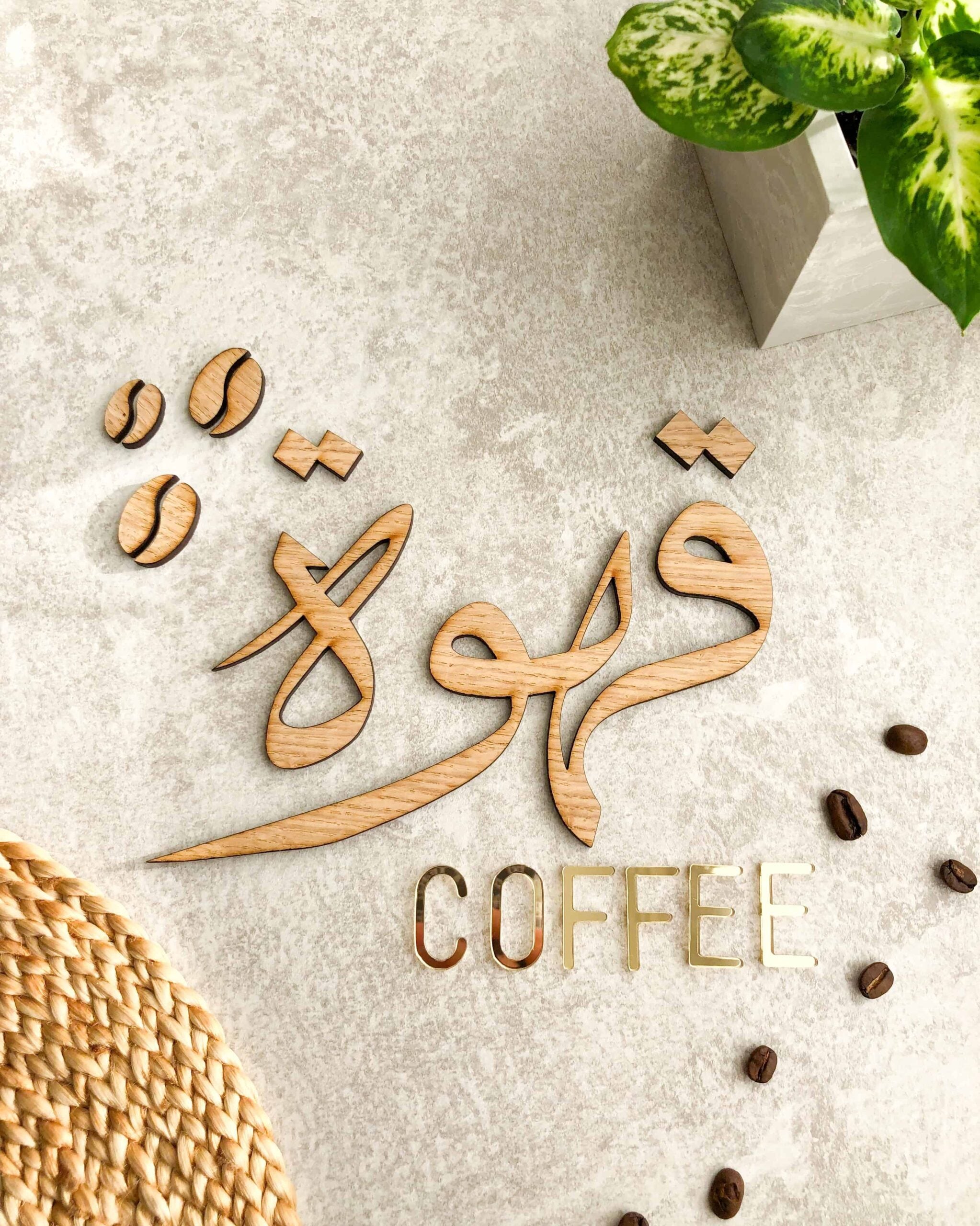 Kaffeskilt i træ og akryl til dit kaffehjørne i hjemmet med en blanding af kalligrafi og latin skrift. Det giver en unik måde at indrette dit kaffehjørne i hjemmet og faciliterer en ekstra hyggelig stemning til kaffeelskerne.