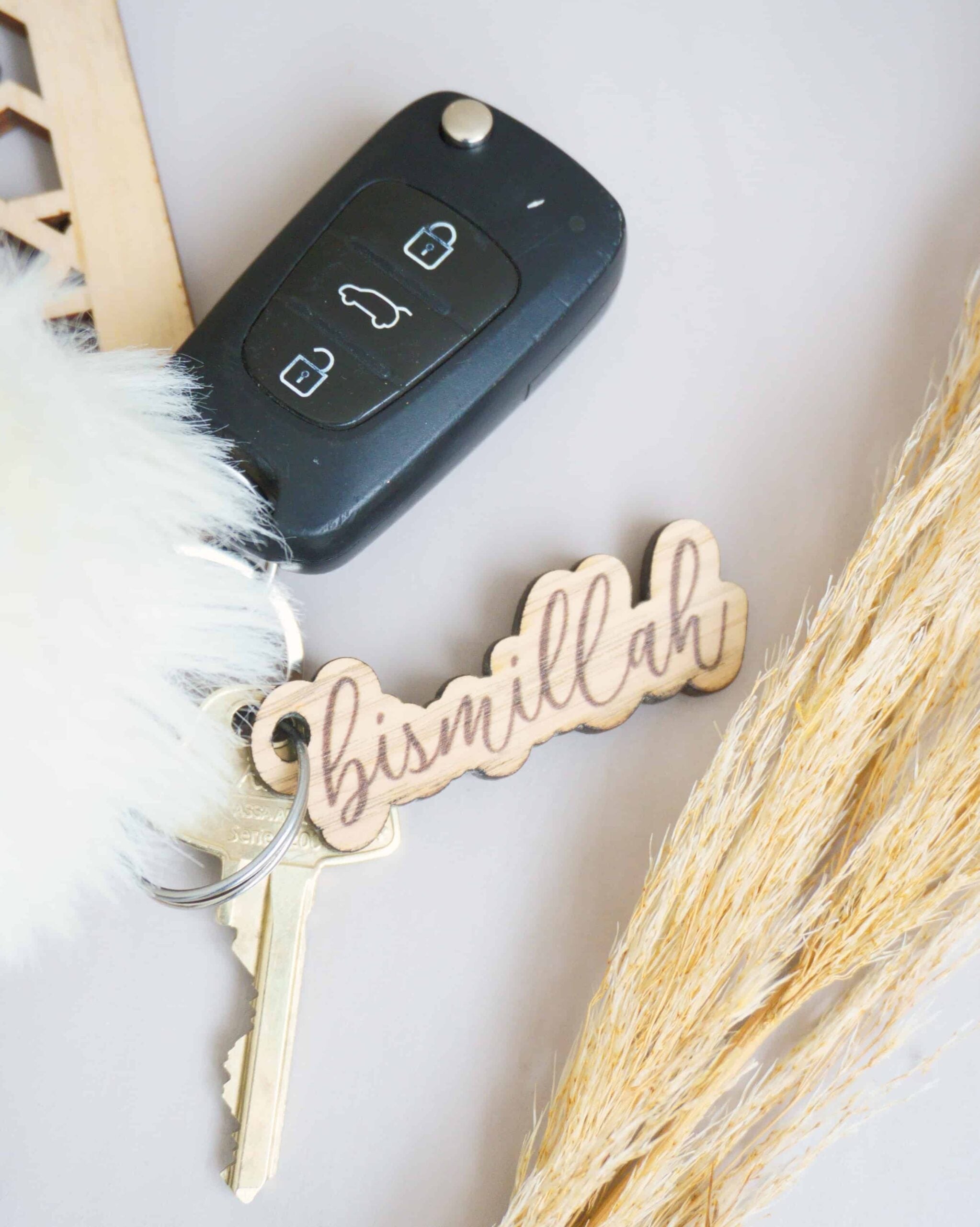 Nøglering i egefinér med teksten “Bismillah”. En unik påmindelse til en selv og oplagt gave til ens nære.