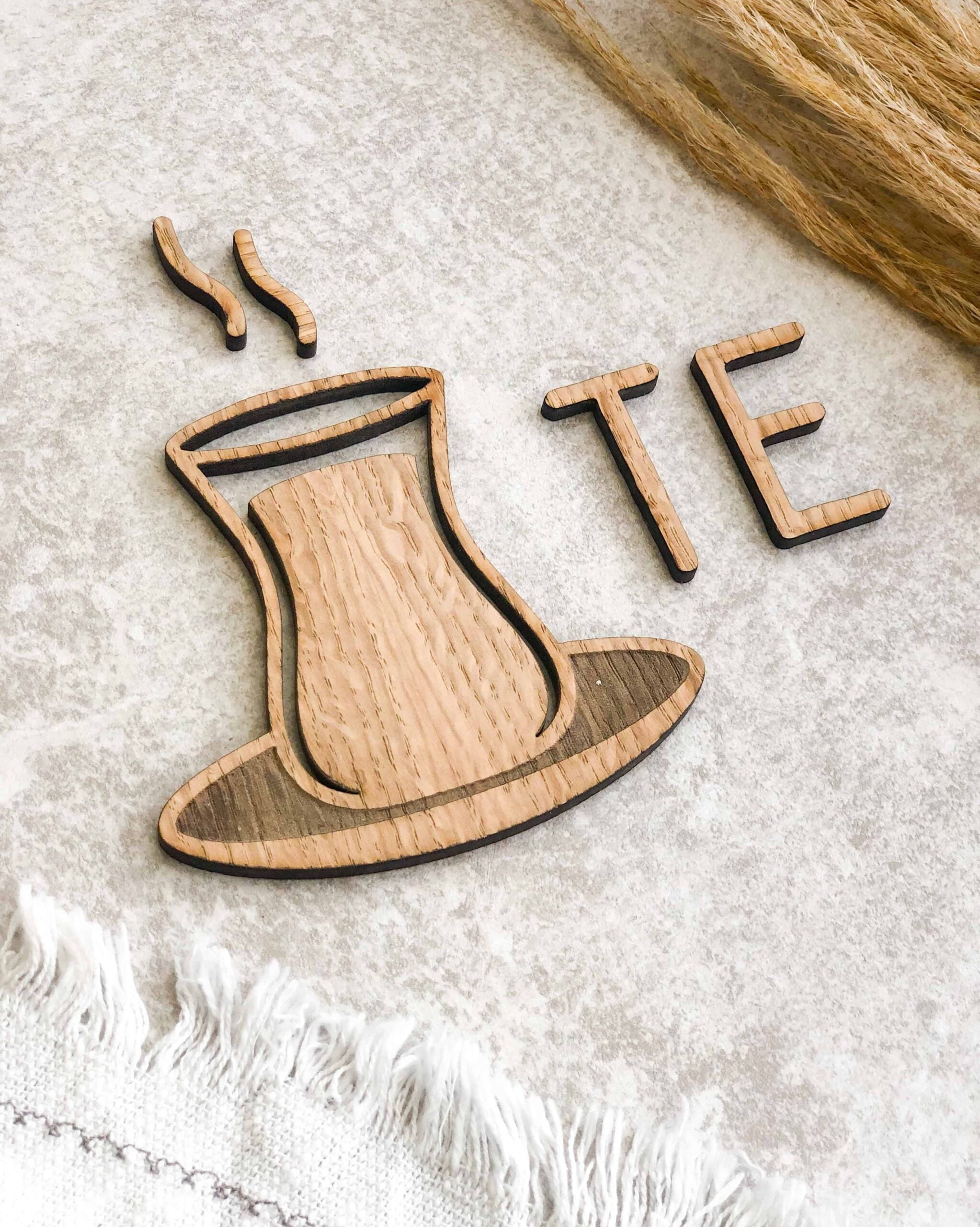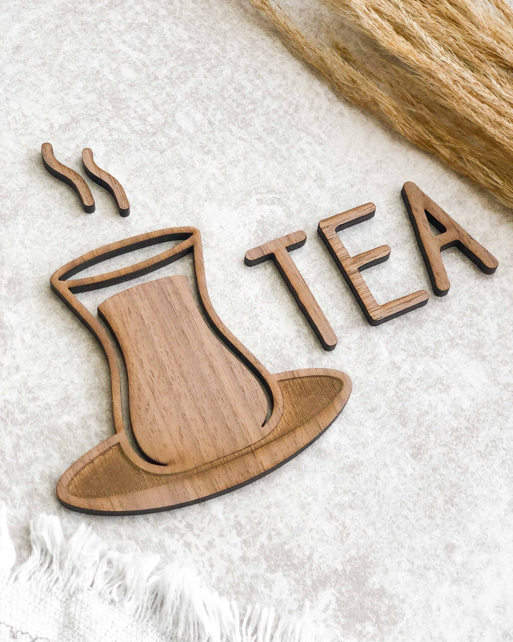 Te skilt i træ og akryl til dit te-hjørne i hjemmet – med en tyrkisk/bosnisk kop til te. Det giver en unik måde at indrette dit te-hjørne på i hjemmet og faciliterer en ekstra hyggelig stemning til te elskerne.